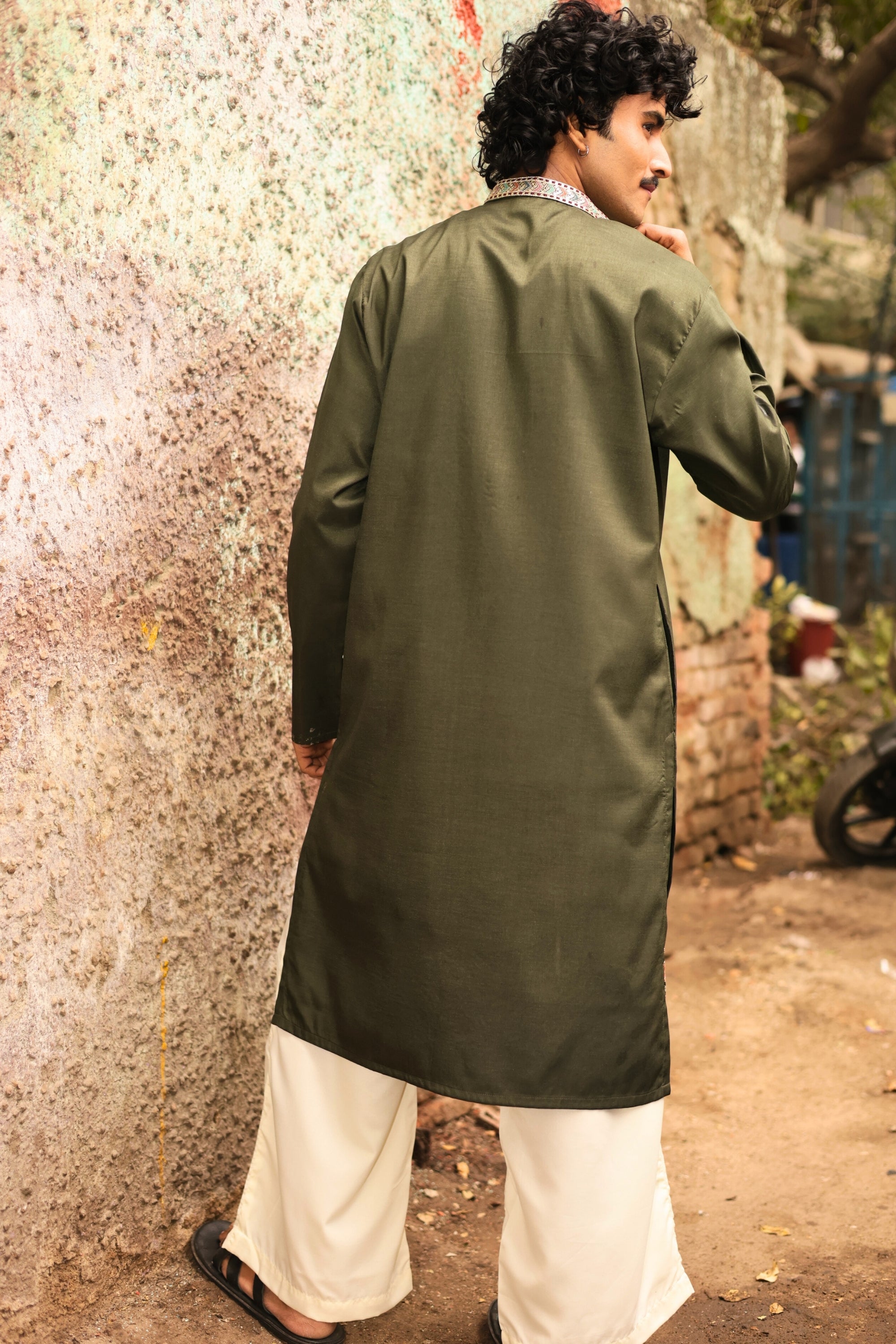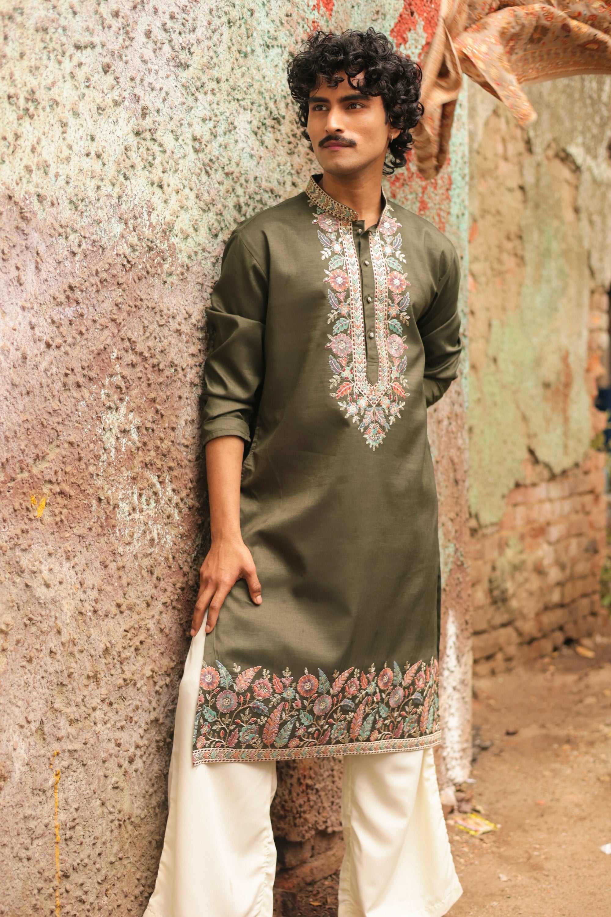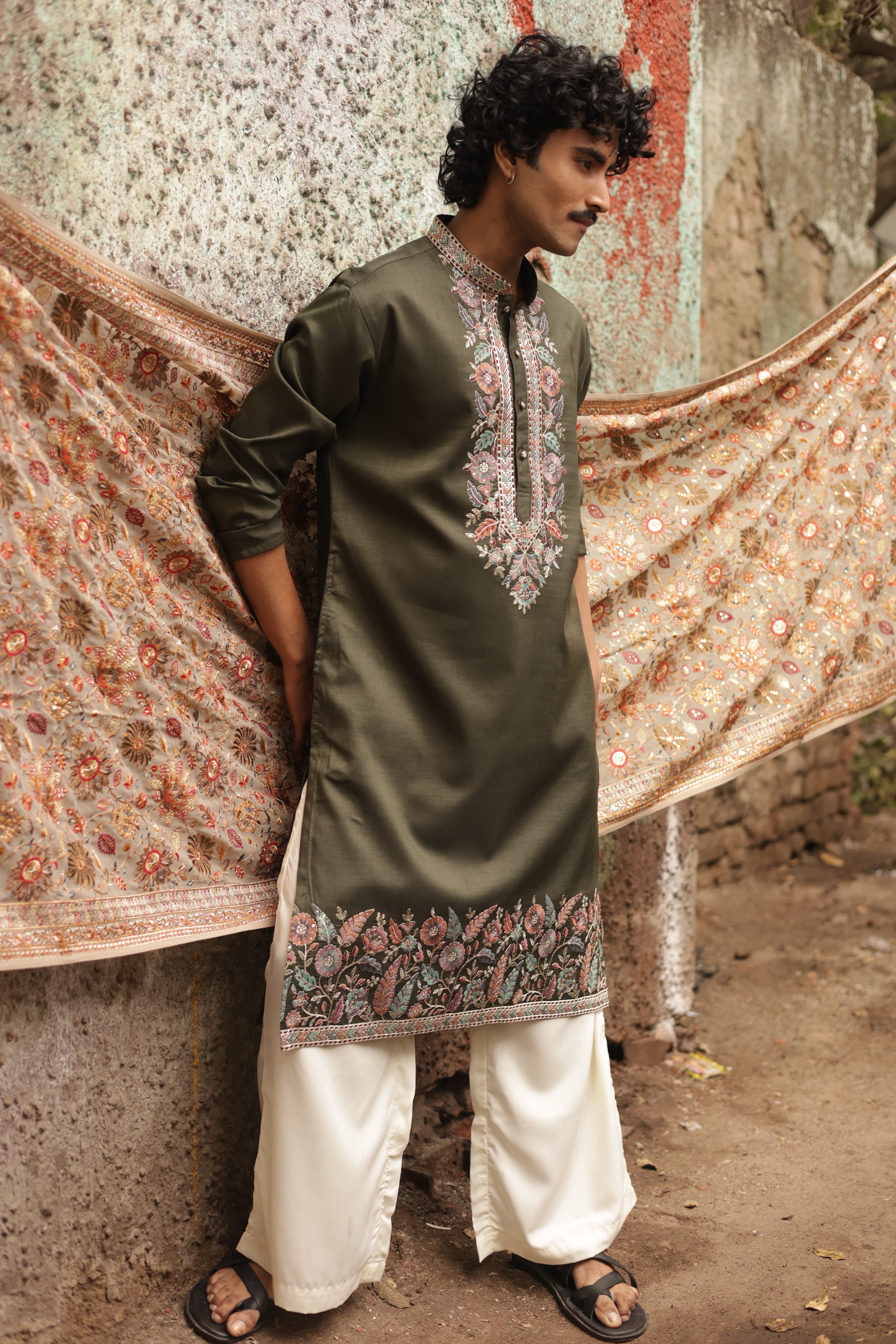Green Signal is the moment everything moves. Crafted in a deep olive tone with intricate floral embroidery along the neckline and hem, this kurta blends festive richness with grounded confidence. The detailed threadwork adds celebration, while the clean silhouette keeps it sharp and effortless.