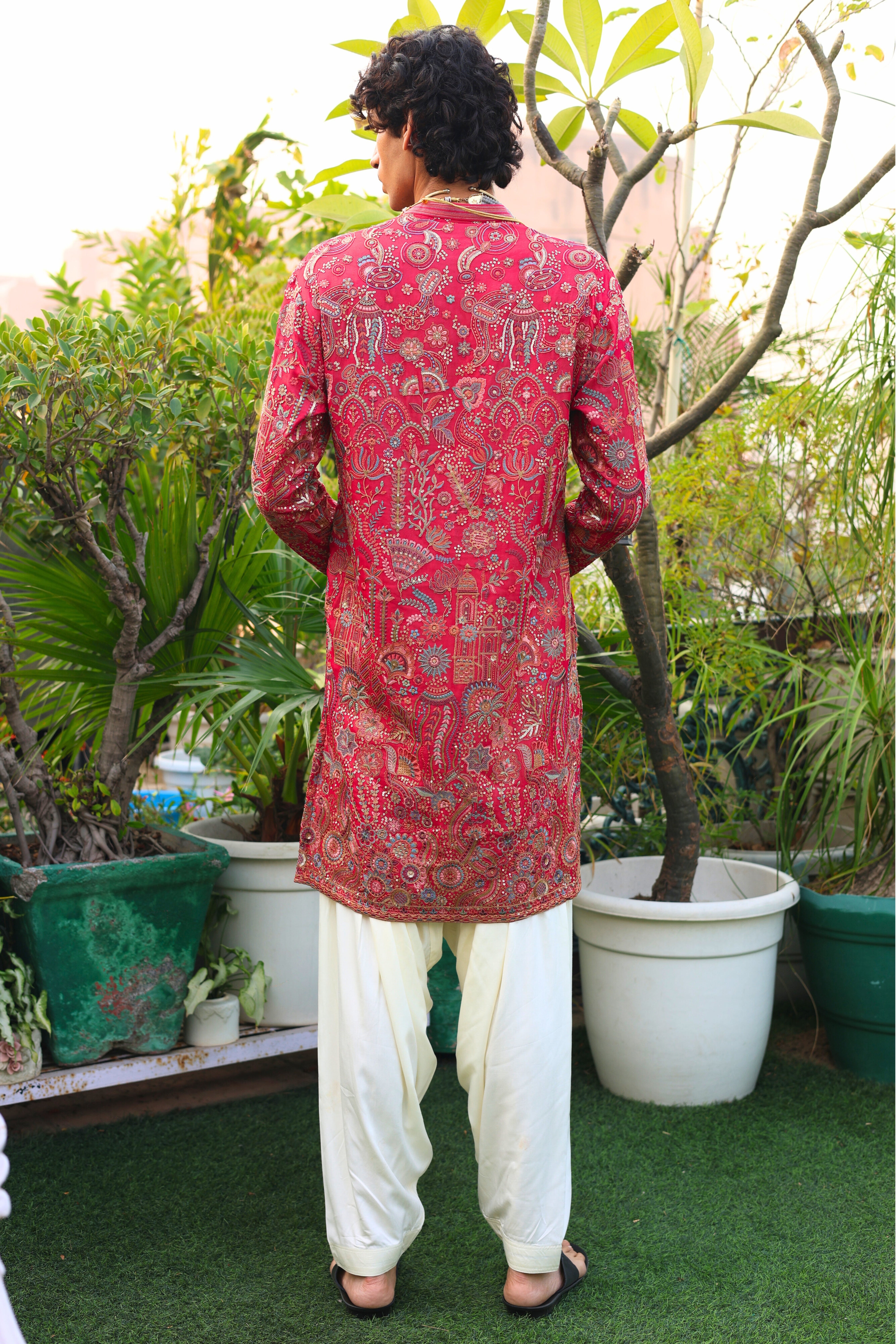 Gulbaag — Red Heritage Kurta with Ivory Salwar is crafted with restraint and finished with quiet authority. This handcrafted red kurta features a rich tapestry of traditional motifs woven into luxurious fabric, blending heritage artistry with contemporary elegance. Its clean lines and assured character create a presence that speaks without noise, making it ideal for festive occasions and intimate celebrations. Paired with an ivory salwar that adds balance and softness, the ensemble stands refined and timeless.