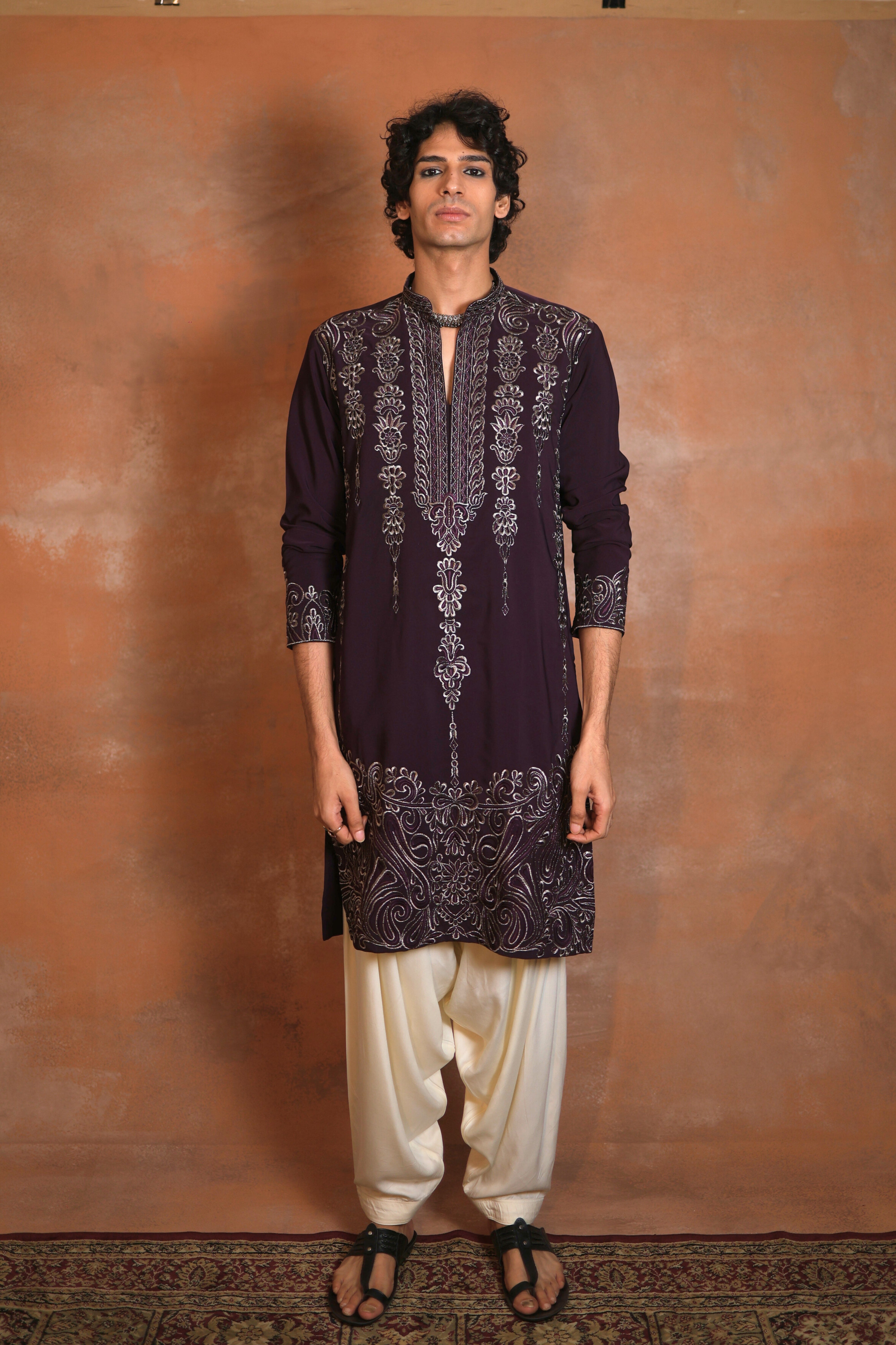 Gulzar — paired with an ivory salwar — is richly detailed, poised, and unmistakably regal. The deep plum kurta features intricate silver embroidery that cascades gracefully across the neckline and hem in perfect symmetry. Its artwork adds depth without excess, keeping the silhouette refined and effortless. Paired with the soft contrast of an ivory salwar, the ensemble strikes a beautiful balance of light and dark, where tradition meets quiet elegance.