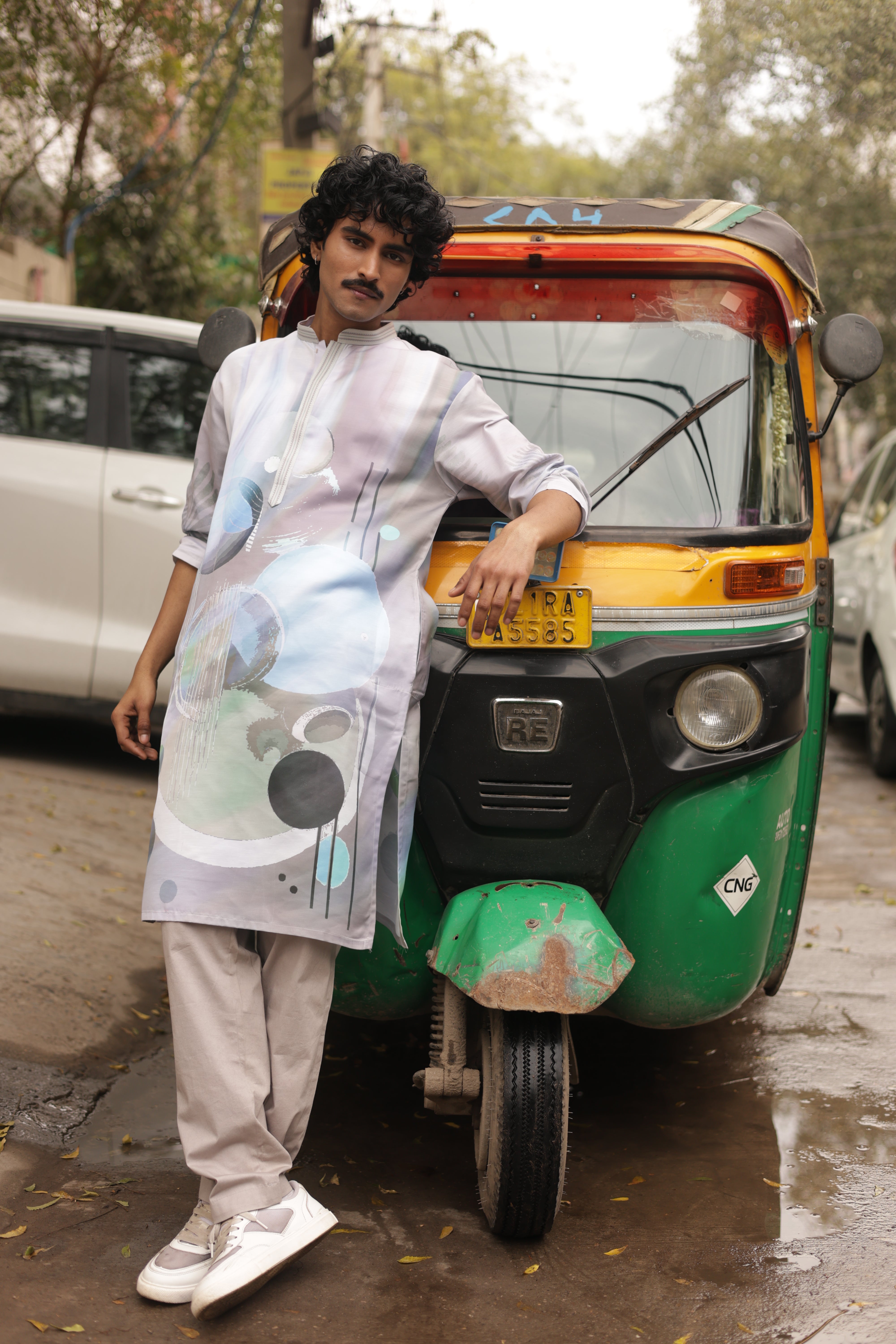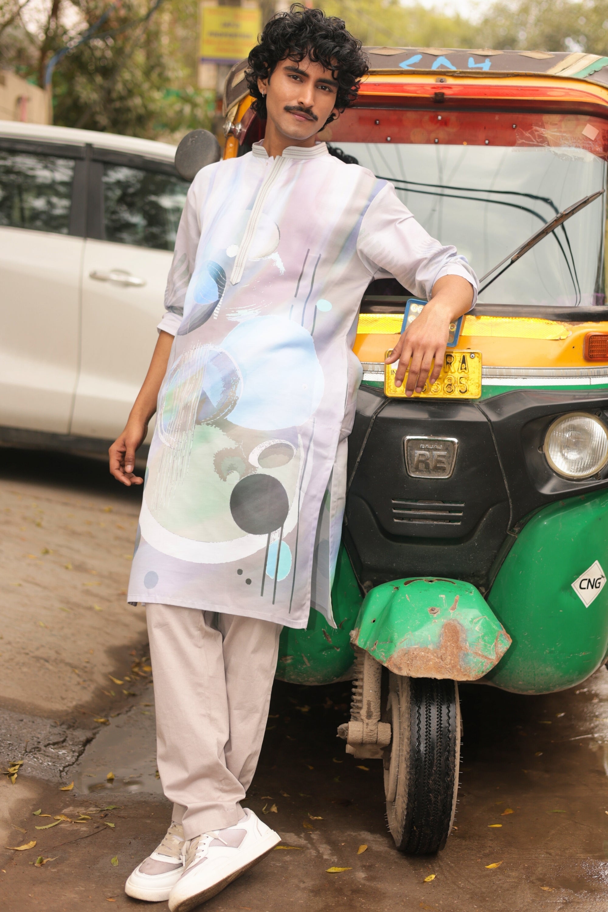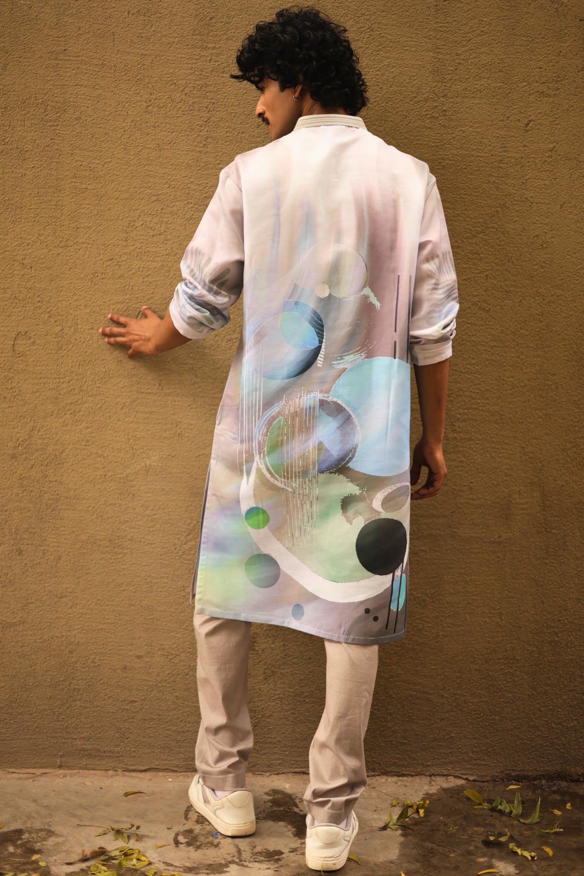 Light Action is where contemporary art meets everyday movement. Crafted on a cool grey base, the kurta features fluid abstract motifs in soft blues and muted greens—creating depth without overpowering the look. The clean band collar and minimal placket detailing keep the structure sharp, while the relaxed silhouette ensures ease through long celebrations and city strolls alike.