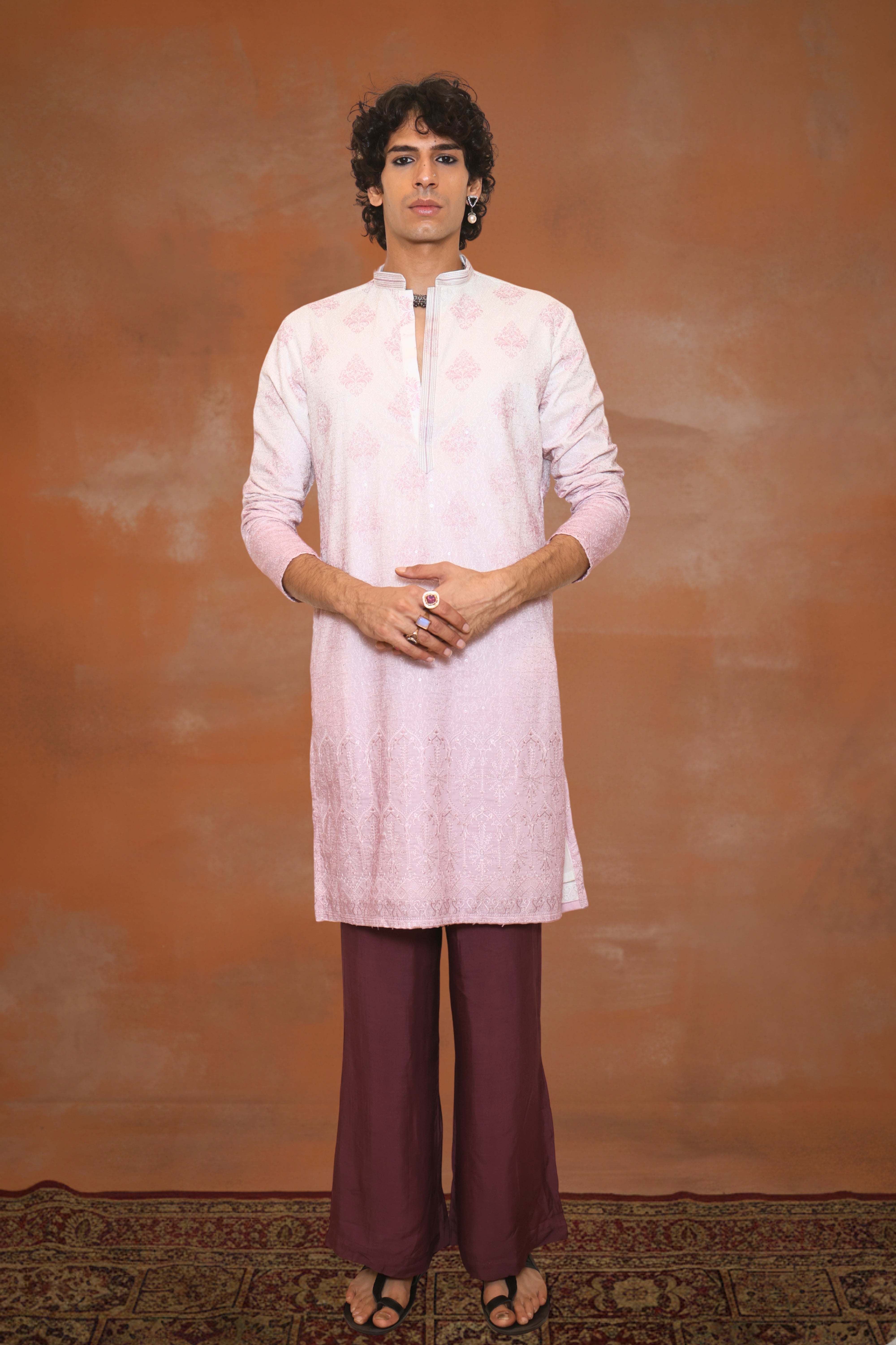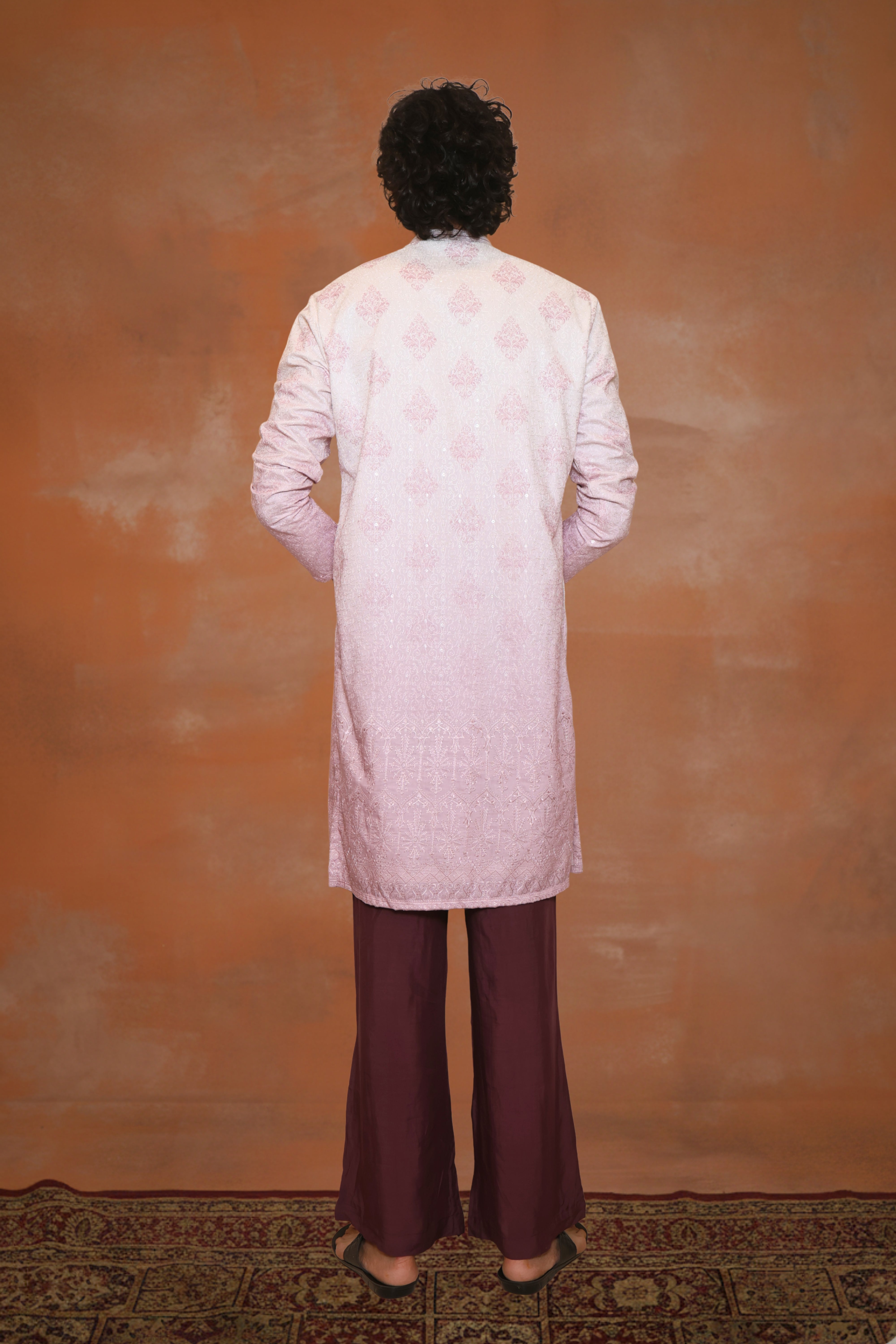 Nuraab — paired with maroon pants — is soft, radiant, and quietly distinguished. This blush-pink kurta carries a gentle sheen, enhanced by intricate jacquard work that adds refined texture without excess. Its pastel luminosity is beautifully balanced by the maroon pants, creating an ensemble that feels serene, polished, and effortlessly graceful.